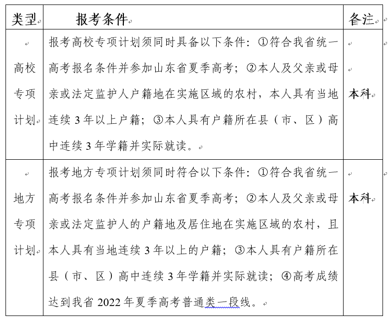 答:地方专项计划招生是我省面向农村和原贫困地区实施的招生类型,均为本科层次,招生高校主要为我省省属重点高校。高考成绩公布后,考生须于6月30日前到所在县(市、区)教育(教体)局资格审核承办部门进行资格审核,具体报名条件要求,请登录山东省教育厅官网查看《关于做好2022年面向农村和脱贫地区学生招生专项计划工作的通知》。获得我省地方专项资格的考生需在普通类常规批填报地方专项计划志愿。