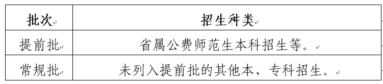 专科批。根据招生计划数与考生成绩,在有效生源范围内,分专业类别按招生计划1:1.3的比例一次性划定;高职院校专项计划根据招生计划、生源情况及考生成绩,单独划定文化录取分数线;未达到本科线的技能拔尖人才考生,可填报专科志愿并录取。